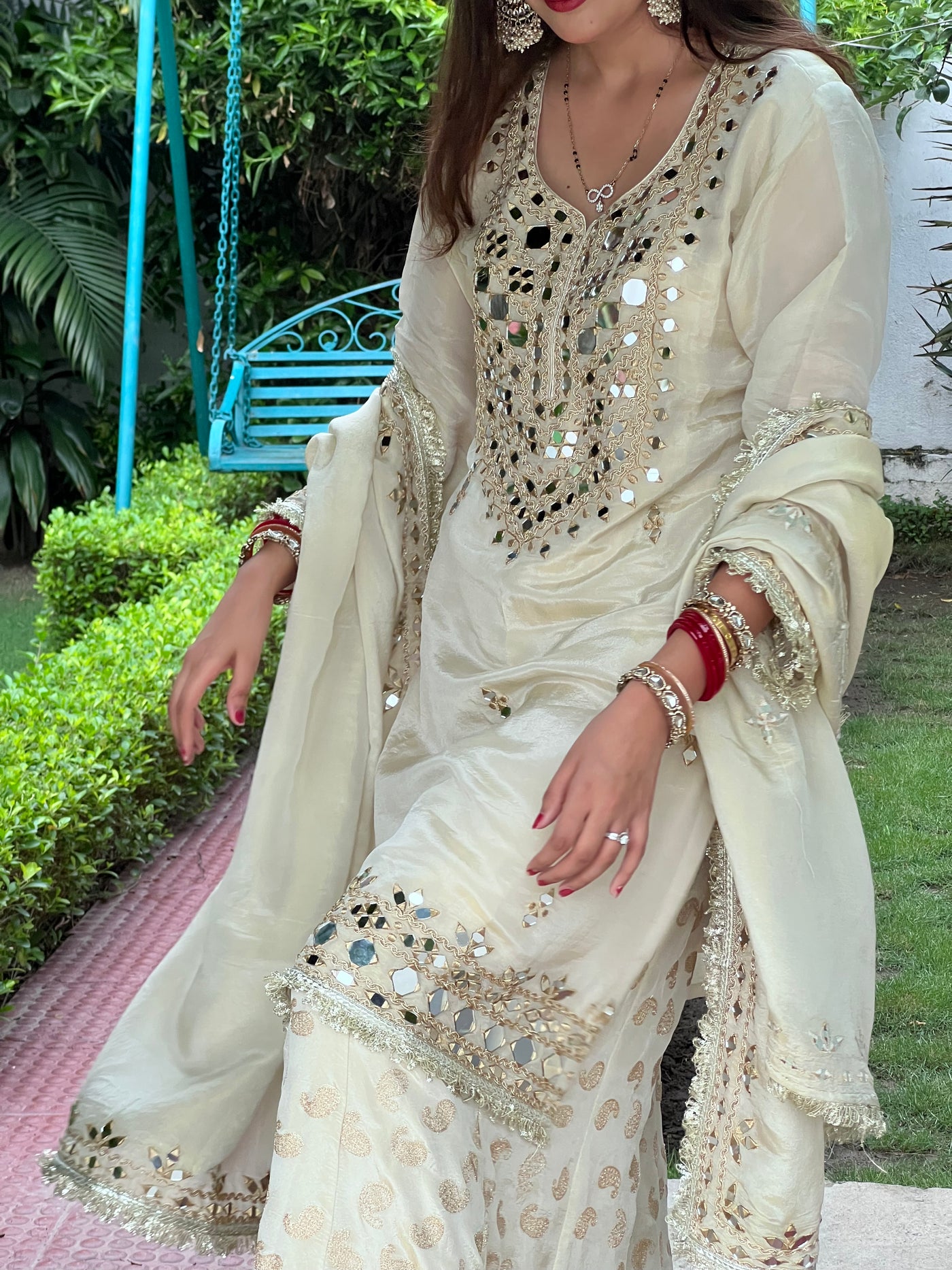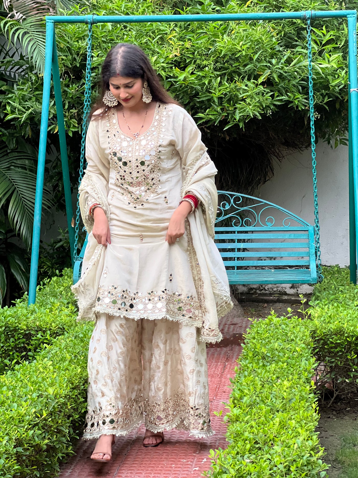 Step into timeless elegance with this handcrafted ivory sharara set.