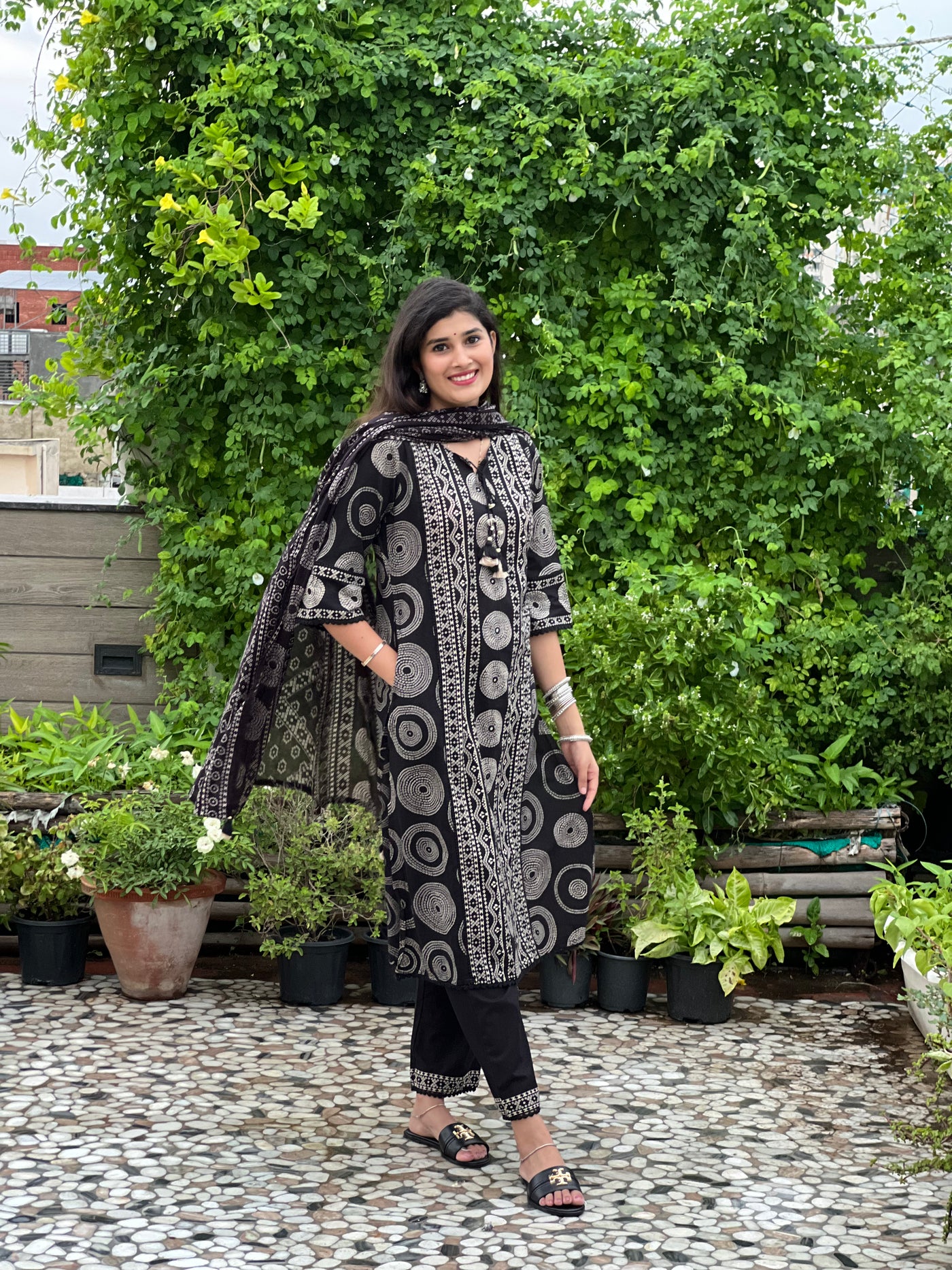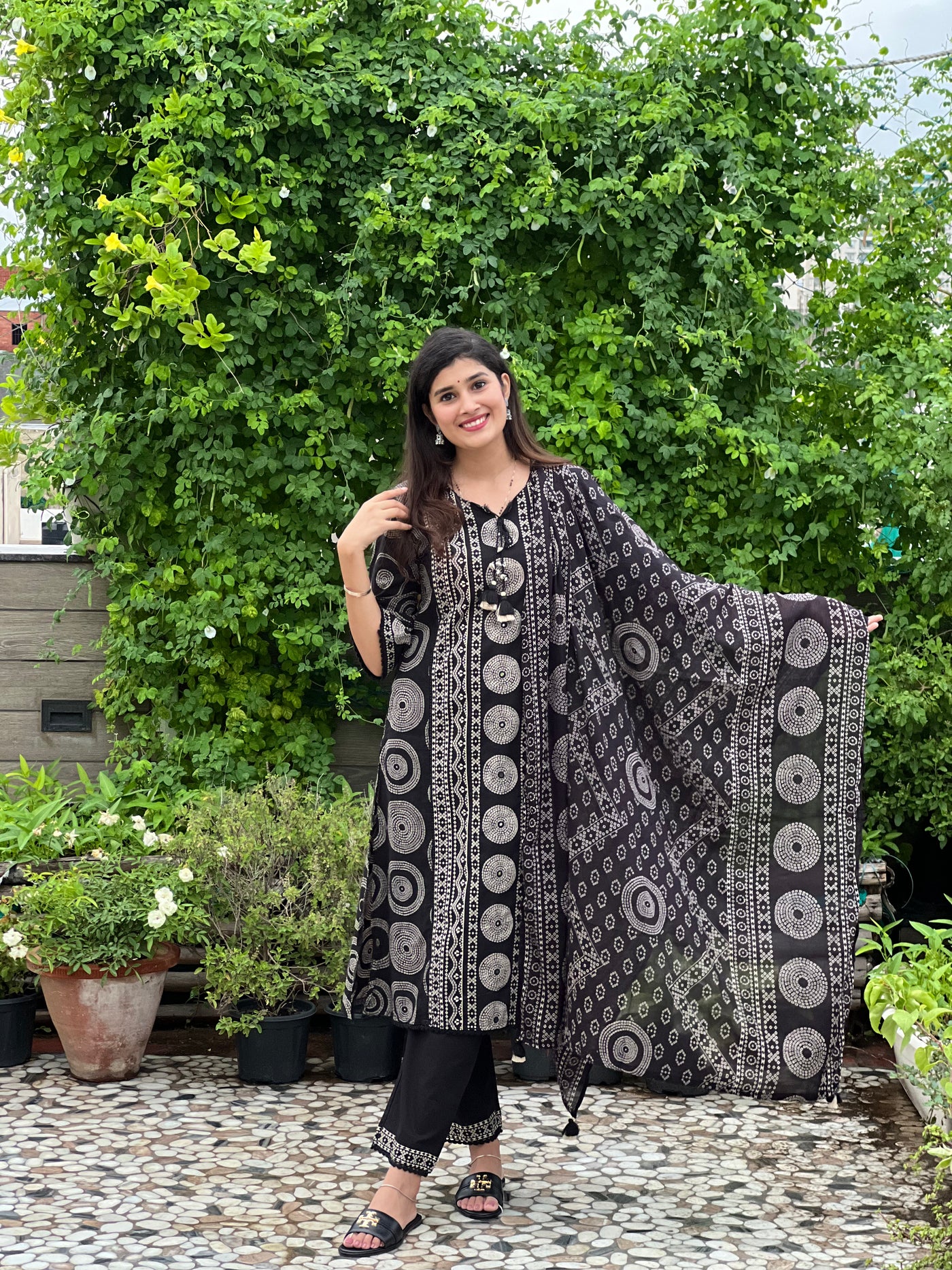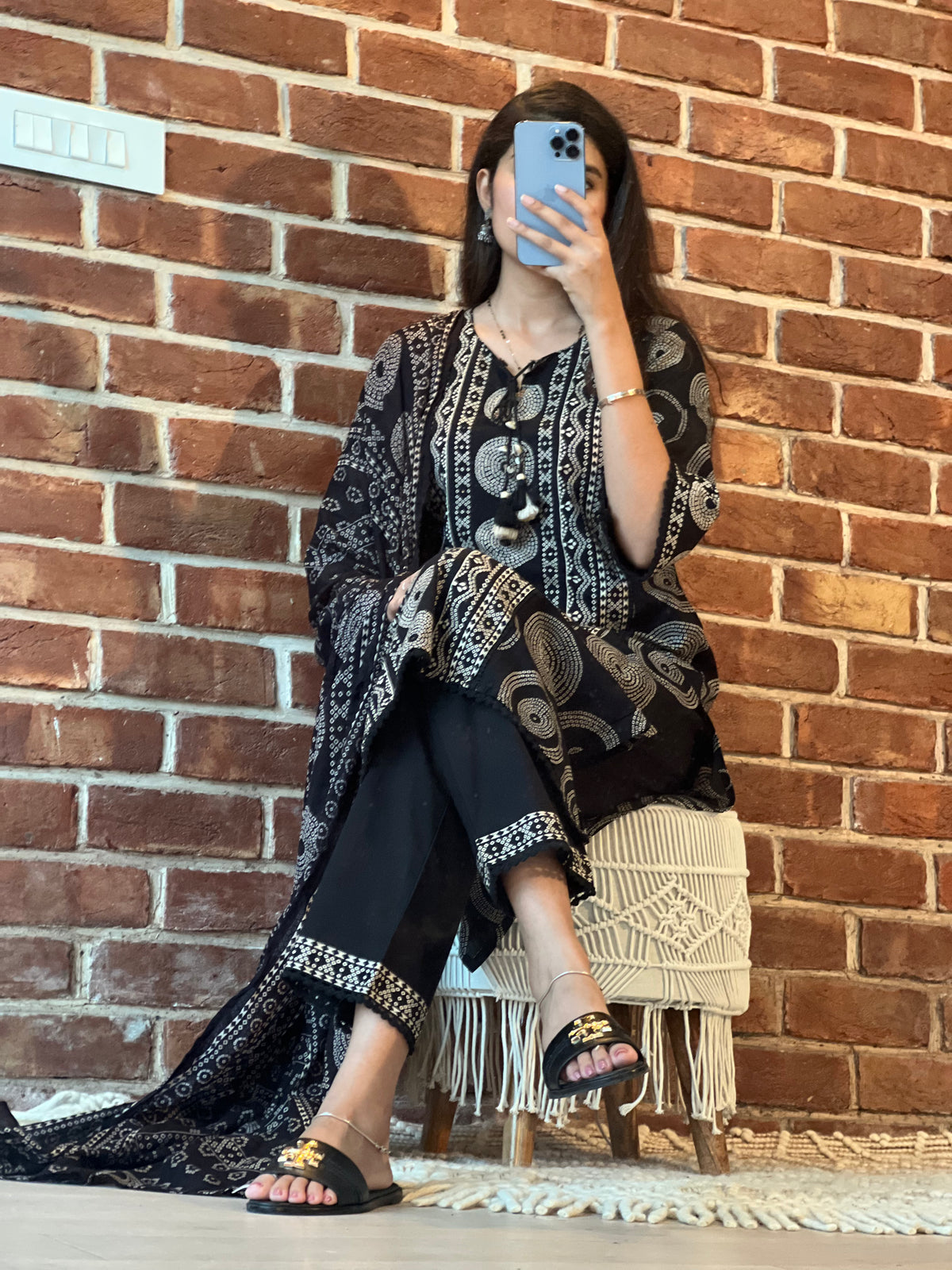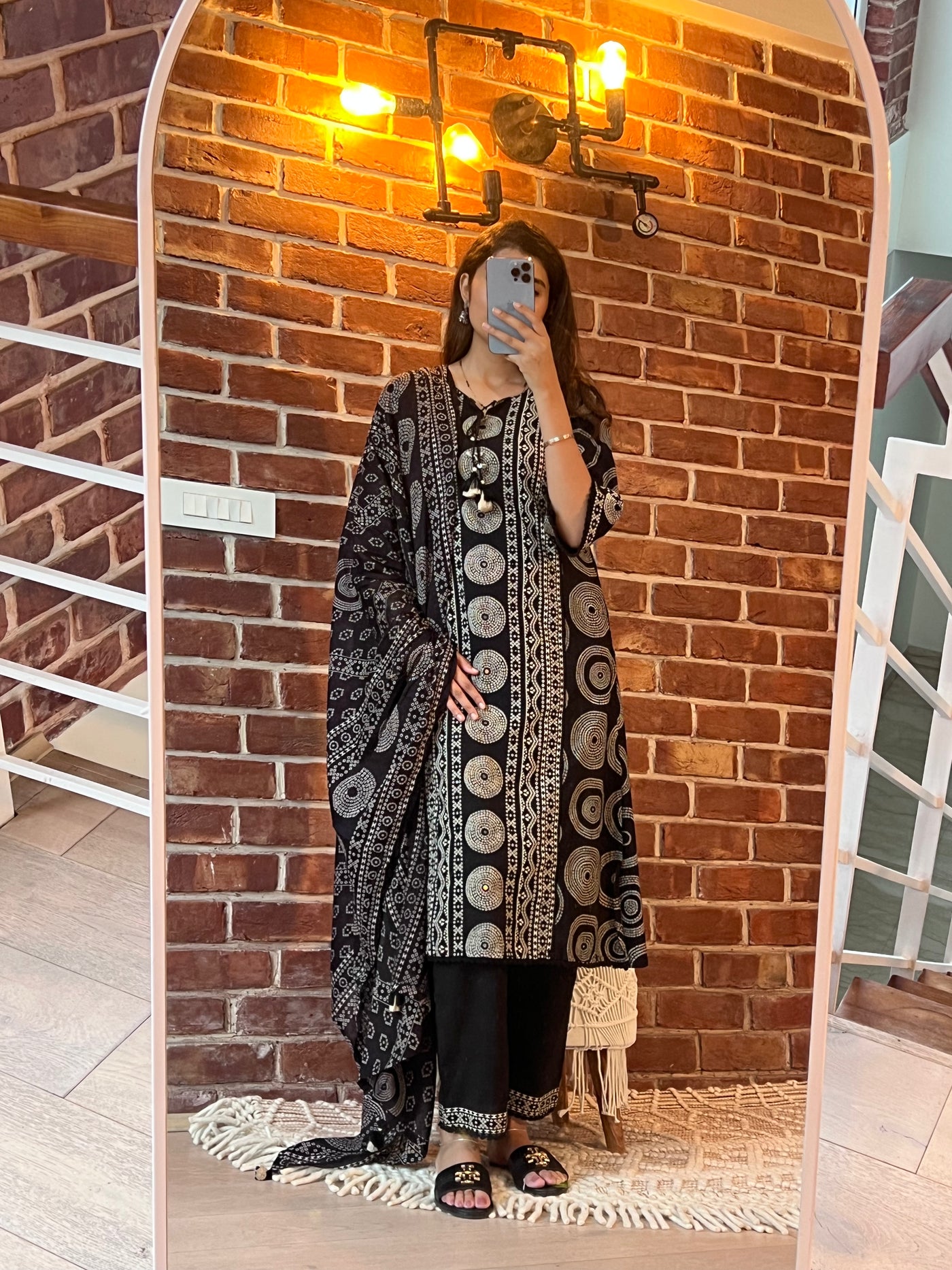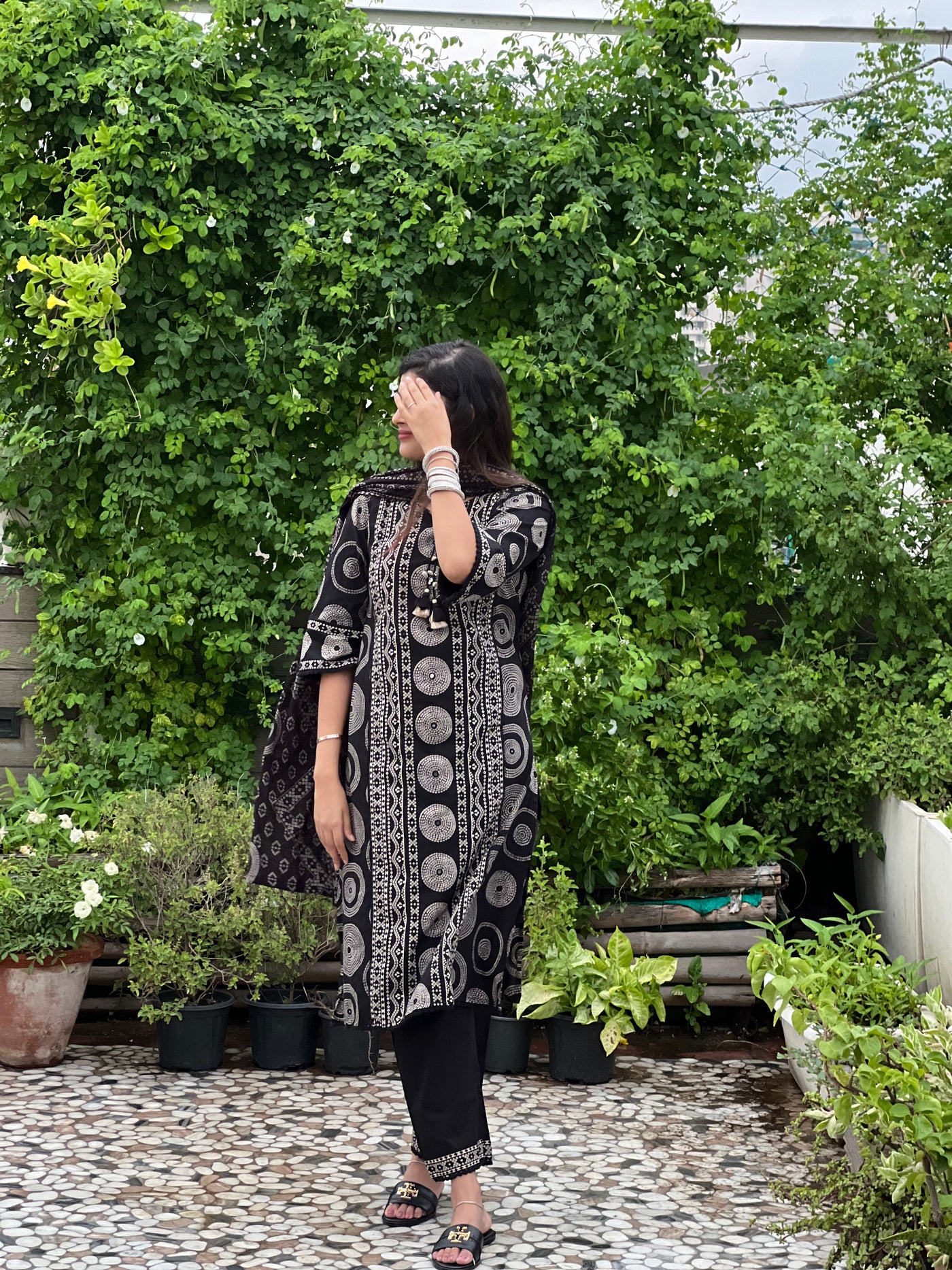 • Fabric: Pure Cotton • Work: Traditional block-style print with thread work detailing on the bottom • Style: Straight kurta with V-neck, pockets on both sides, paired with printed dupatta and thread-worked pants for a refined look