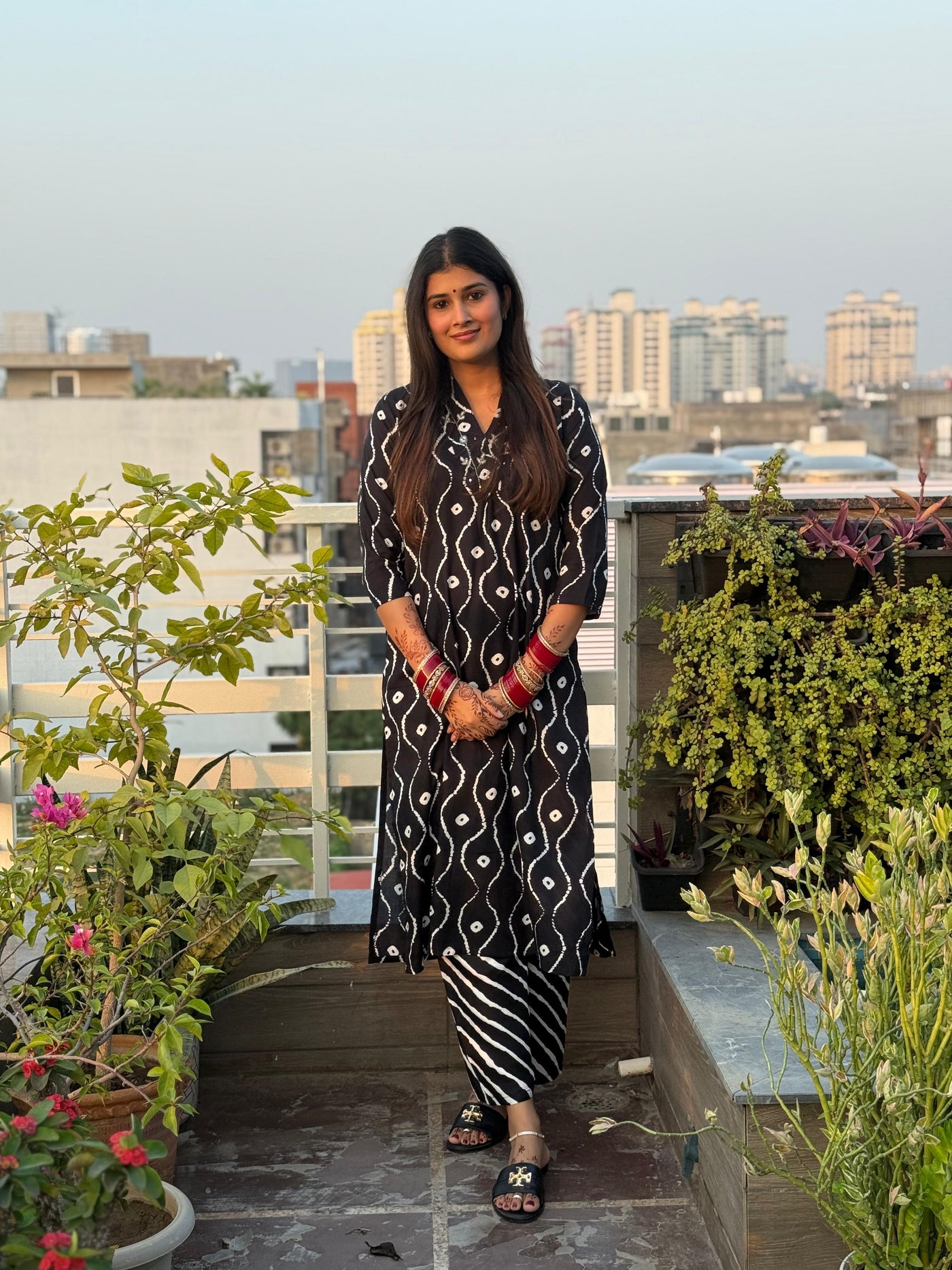Fabric: Pure Cotton Work: Handcrafted Ikat Print Style: Black & White Printed Kurta with Contrast Striped Pants – Effortlessly Chic, Perfect for Casual Days or Coffee Dates