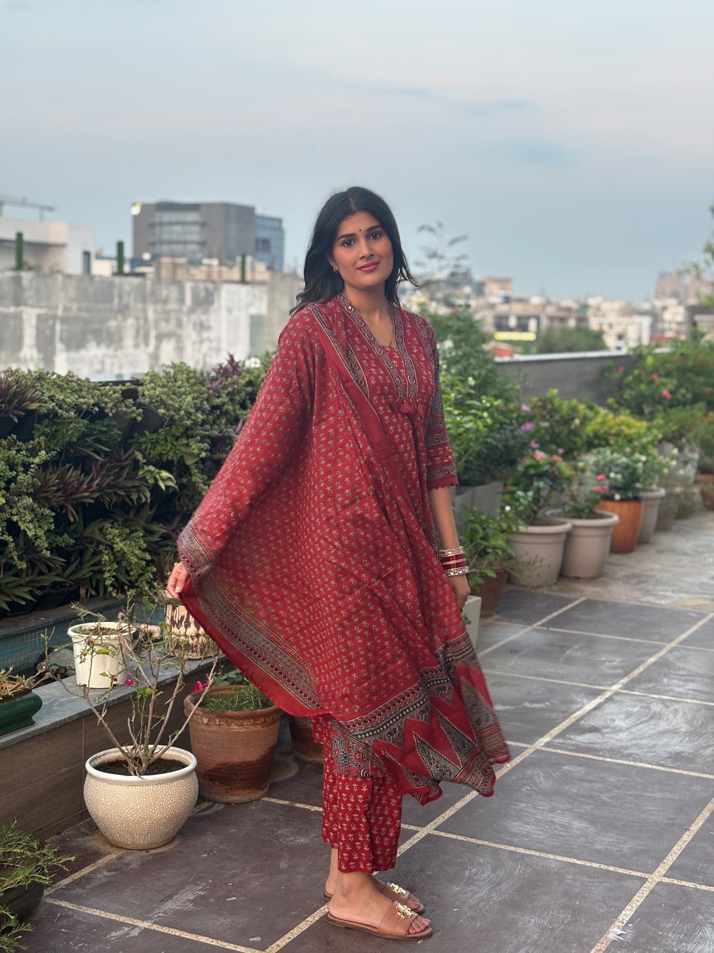 The deep red cotton suit is the perfect blend of comfort and charm.